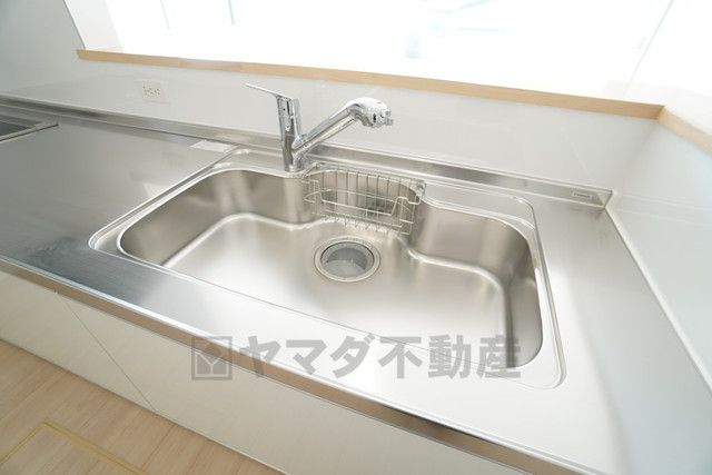 大きなお鍋も楽々洗える幅の広いシンクです^^ステンレスシンクなので簡単にお掃除できますよ。洗剤やスポンジもすっきりできる収納付き。