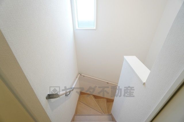 お子様も高齢の方も安心して上り下りができる手摺がついた安心設計です。 階段には小窓を配置しました。日中でも暗くなりがちな階段下が明るくなり安全ですね。