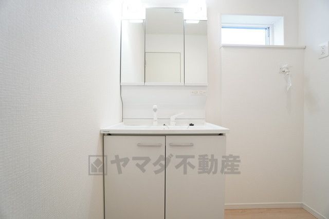 三面鏡裏収納付き洗面化粧台です^^ 歯磨きセットやスキンケア用品などの収納に便利ですね。ランドリースペース上部には窓も付いており換気に便利です^^