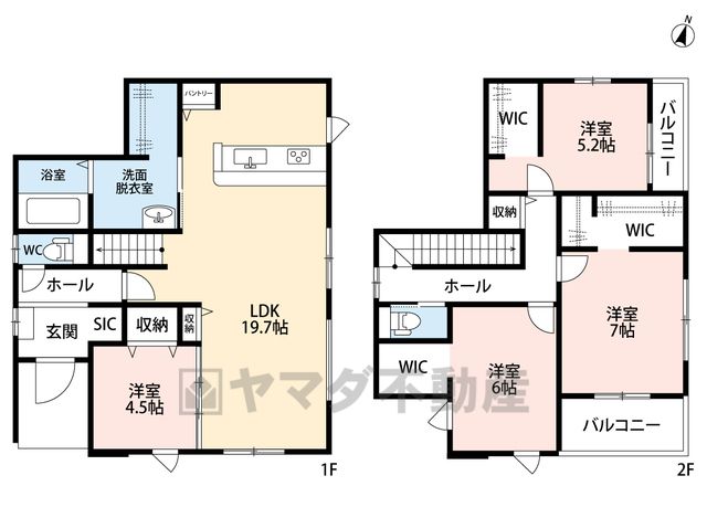 LDK19.7畳(1F)、洋4.5畳(1F)、洋7畳(2F)、洋6畳(2F)、洋5.2畳(2F) |