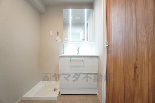 三面鏡裏収納付き洗面化粧台です^^ 歯磨きセットやスキンケア用品などの収納に便利ですね。 生活感も隠すことができ、来客時にも安心です。