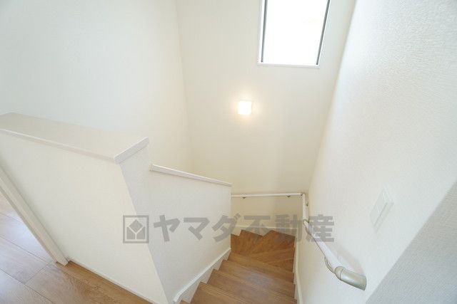 お子様も高齢の方も安心して上り下りができる手摺がついた安心設計です。 階段には小窓を配置しました。日中でも暗くなりがちな階段下が明るくなり安全ですね。