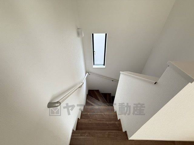 お子様も高齢の方も安心して上り下りができる手摺がついた安心設計です。 階段には小窓を配置しました。日中でも暗くなりがちな階段下が明るくなり安全ですね。