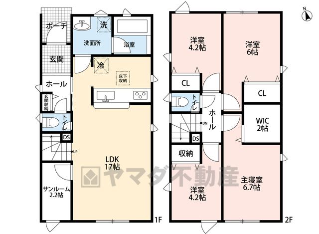 LDK17畳(1F)、洋6.7畳(2F)、洋6畳(2F)、洋4.2畳(2F) |