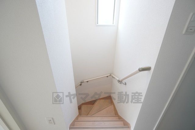 お子様も高齢の方も安心して上り下りができる手摺がついた安心設計です。 階段には小窓を配置しました。日中でも暗くなりがちな階段下が明るくなり安全ですね。