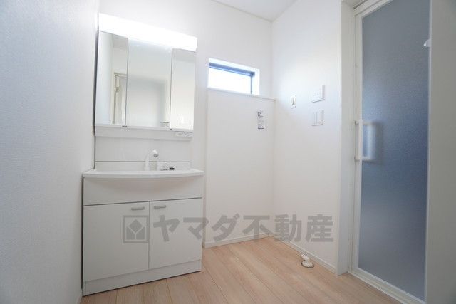 三面鏡裏収納付き洗面化粧台です^^ 歯磨きセットやスキンケア用品などの収納に便利ですね。