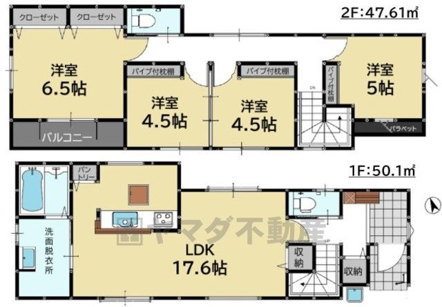 LDK17.6畳(1F)、洋6.5畳(2F)、洋5畳(2F)、洋4.5畳(2F) |