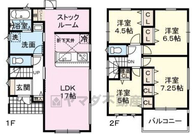 LDK17畳(1F)、洋7.2畳(2F)、洋6.5畳(2F)、洋5畳(2F)、洋4.5畳(2F) |