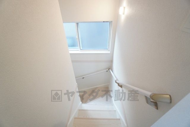 お子様も高齢の方も安心して上り下りができる手摺がついた安心設計です。 階段には小窓を配置しました。日中でも暗くなりがちな階段下が明るくなり安全ですね。