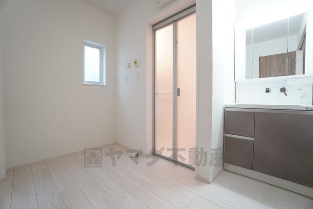 三面鏡裏収納付き洗面化粧台です^^ 歯磨きセットやスキンケア用品などの収納に便利ですね。脱衣スペースも広々としていて嬉しいですね^^