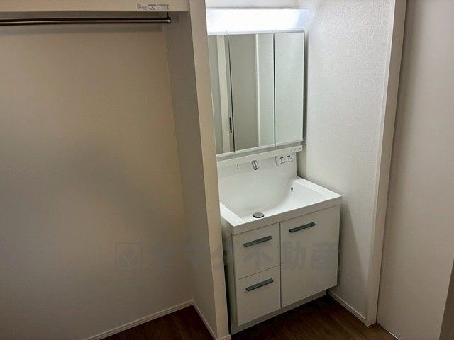三面鏡裏収納付き洗面化粧台です^^ 歯磨きセットやスキンケア用品などの収納に便利ですね。 生活感も隠すことができ、来客時にも安心です。