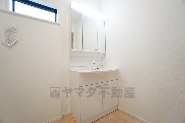 三面鏡裏収納付き洗面化粧台です^^ 歯磨きセットやスキンケア用品などの収納に便利ですね。 ランドリースペース上部には窓も付いており換気に便利です^^