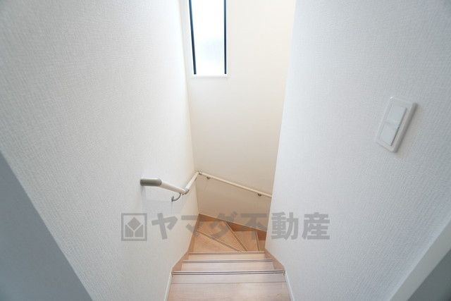 お子様も高齢の方も安心して上り下りができる手摺がついた安心設計です。 階段には小窓を配置しました。日中でも暗くなりがちな階段下が明るくなり安全ですね。