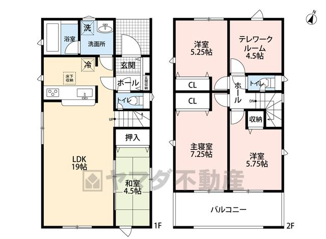LDK19畳(1F)、和4.5畳(1F)、洋7.2畳(2F)、洋5畳(2F)、洋5.2畳(2F) |