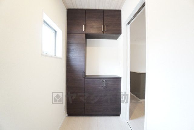 キッチン横には可動棚タイプのパントリーとリビング収納有^^ 長期保存ができるもの、調理器具、防災グッズを入れておくのもいいですね。