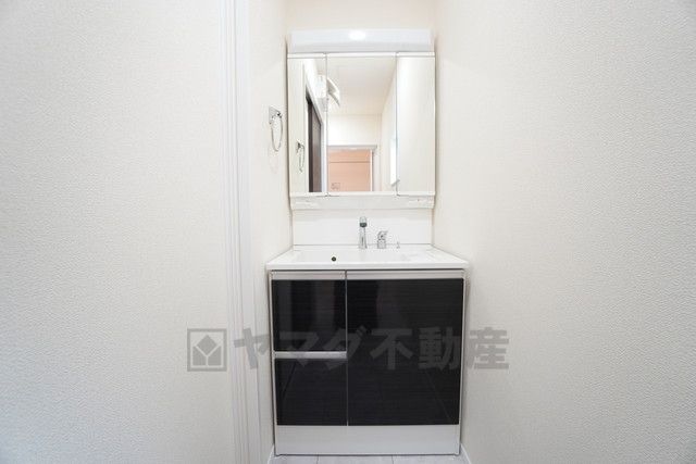 三面鏡裏収納付き洗面化粧台です^^ 歯磨きセットやスキンケア用品などの収納に便利ですね。 生活感も隠すことができ、来客時にも安心です。