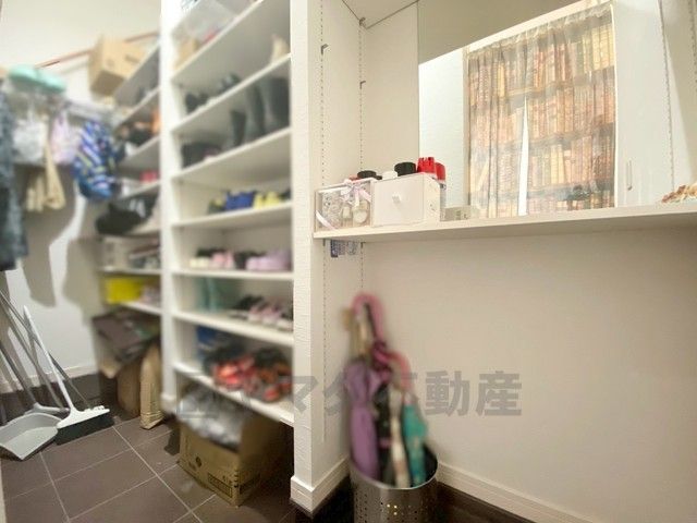 玄関にはシューズクローク付き。ご家族全員分の靴からベビーカーやゴルフバッグなどもしっかり収納できます^^