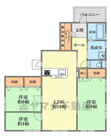 LDK18畳、洋9畳、洋6畳、洋4畳 |