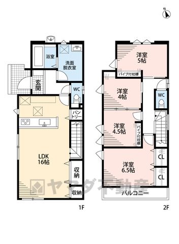 LDK16畳(1F)、洋6.5畳(2F)、洋5畳(2F)、洋4.5畳(2F)、洋4畳(2F) |