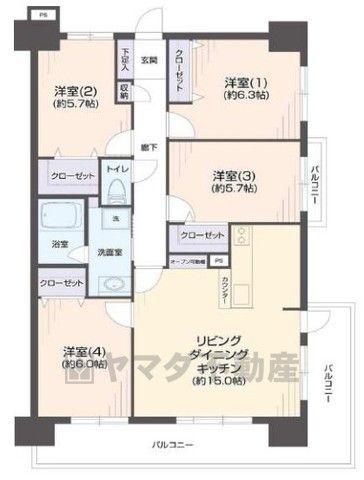 LDK15畳、洋6.3畳、洋6畳、洋5.7畳 |