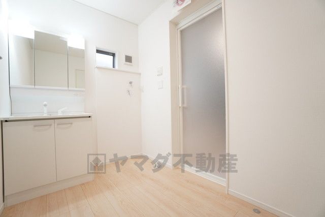 三面鏡裏収納付き洗面化粧台です^^ 歯磨きセットやスキンケア用品などの収納に便利ですね。 ランドリースペース上部には窓も付いており換気に便利です^^