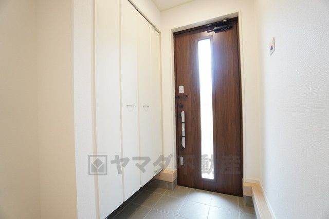 玄関扉にスリットのある明るい玄関です^^ たっぷり収納できるシューズボックス付きなので、家族全員の靴がきれいに整頓できます。