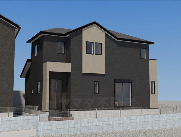 完成予想図。ブラックを基調とした外壁に、やわらかなベージュのアクセントを組み合わせた、上品で落ち着きのあるモダンな外観です。