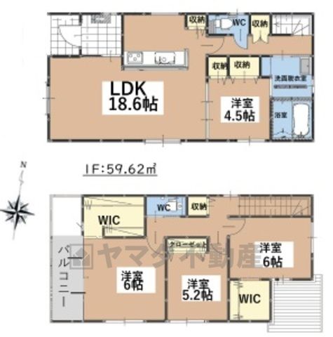 LDK18.6畳(1F)、洋4.5畳(1F)、洋6畳(2F)、洋6畳(2F)、洋5.2畳(2F)、S0畳(1F) |