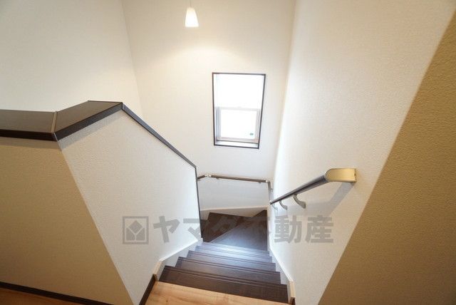 お子様も高齢の方も安心して上り下りができる手摺がついた安心設計です。 階段には小窓を配置しました。