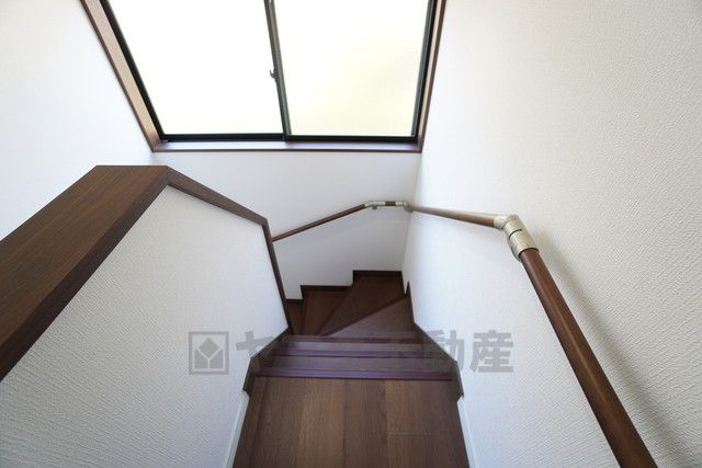 お子様も高齢の方も安心して上り下りができる手摺がついた安心設計です。 階段には小窓を配置しました。