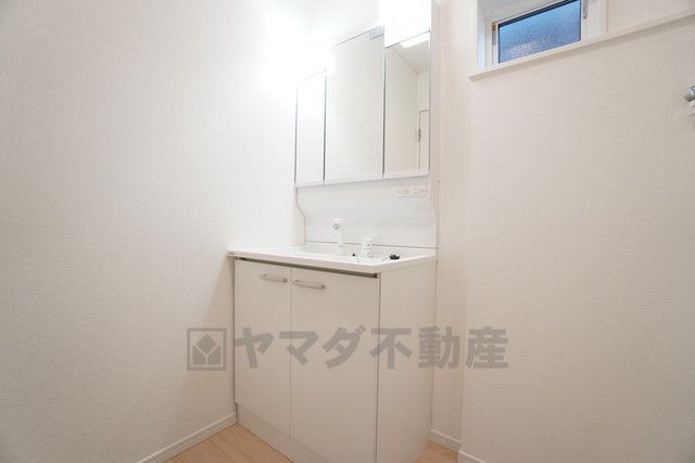 三面鏡裏収納付き洗面化粧台です^^ 歯磨きセットやスキンケア用品などの収納に^^ ランドリースペース上部には窓も付いており換気に便利です。