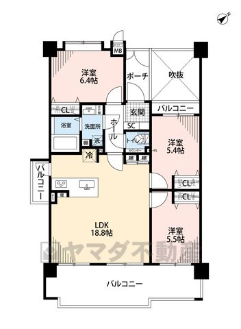 LDK18.8畳、洋6.4畳、洋5.5畳、洋5.4畳 |