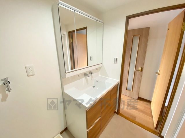 三面鏡裏収納付き洗面化粧台です^^ 歯磨きセットやスキンケア用品などの収納に便利ですね。