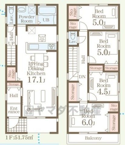 LDK17.1畳(1F)、洋6畳(2F)、洋5畳(2F)、洋4.5畳(2F)、洋0畳 |